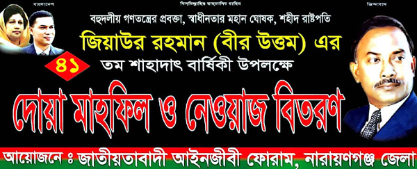 আনোয়ার প্রধান বলেন, বিএনপির প্রতিষ্ঠাতা শহীদ রাষ্ট্রপতি জিয়াউর রহমান ছিলেন মহান স্বাধীনতার ঘোষক এবং বহুদলীয় গণতন্ত্রের প্রবক্তা। তিনি স্বাধীনতার ঘোষনা দিয়েই বসে থাকেননি বরং অস্ত্র হাতে রনাঙ্গণে যুদ্ধ করে দেশকে স্বাধীনতা উপহার দিয়েছেন। আমরা মহান এই নেতার বিদেহী আত্মার মাগফেরাত কামনায় এবং বিএনপির চেয়ারপাসৃন বেগম খালেদা জিয়া ও ভারপ্রাপ্ত চেয়ারম্যান তারেক রহমানের সুস্থ্যতা কামনায় জেলা জাতীয়তাবাদী আইনজীবী ফোরামের উদ্যোগে দোয়া ও নেওয়াজ বিতরণ কর্মসূচি পালন করবো। সোমবার বাদ জোহর নারায়ণগঞ্জ আদালত প্রাঙ্গণে এই কর্মসূচি পালিত হবে।