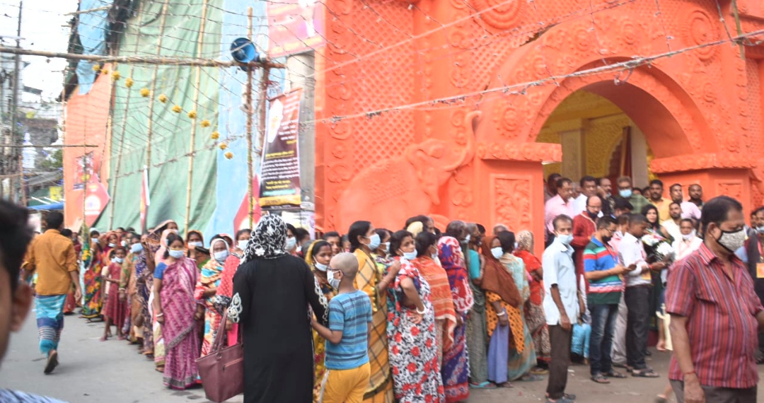 নারায়ণগঞ্জ মেইল: সোমবার ১১ অক্টোবর মহা ষষ্ঠী পূজার মাধ্যমে শুরু হয়েছে হিন্দু ধর্মাবলম্বীদের সবচেয়ে বড় ধর্মীয় উৎসব শারদীয় দুর্গাপূজা। এবারের দুর্গোৎসব শুরুর আগের প্রস্তুতি সভাগুলোতে সনাতন ধর্মাবলম্বীদের নেতারা বারবার বলেছেন স্বাস্থ্যবিধি মেনে আয়োজন করা হবে এবারের দুর্গোৎসব। চলমান করোনা পরিস্থিতির কারণে দুর্গোৎসব আয়োজনে যাতে কোনোভাবেই স্বাস্থ্য বিধি লংঘন না হয় সেদিকে দৃষ্টি রেখে শুধুমাত্র পূজা-অর্চনার মাধ্যমে এবারের শারদ উৎসব পালন করা হবে বলে নিশ্চিত করা হয়েছিল পূজা পরিষদের পক্ষ থেকেও। কিন্তু কথা আর কাজে কোনো মিল পাওয়া যায়নি।