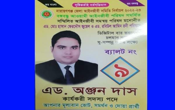 নারায়ণগঞ্জ মেইল: নারায়ণগঞ্জ জেলা আইনজীবী সমিতির নির্বাচনে বঙ্গবন্ধু আওয়ামী আইনজীবী পরিষদ সমর্থিত ও সম্মিলিত আইনজীবী সমন্বয় পরিষদ মনোনীত এড. হাসান ফেরদৌস জুয়েল – এড. রবিউল আমীন রনি প্যানেলের সদস্য পদপ্রার্থী তরুণ আইনজীবী এড. অঞ্জন দাস আইনজীবীদের পছন্দের শীর্ষে ।